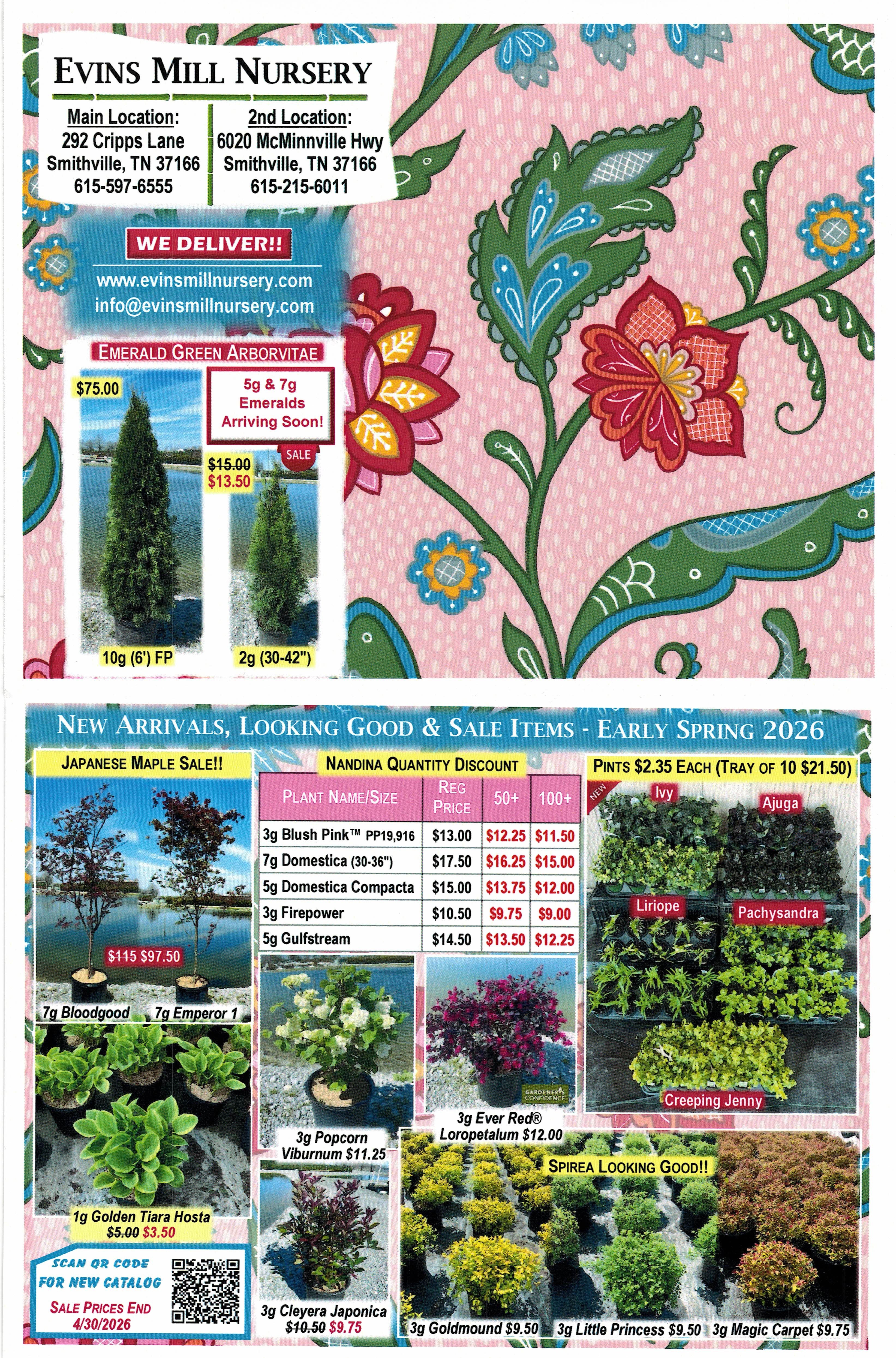 Evins Mill Nursery is located in DeKalb County, Smithville, Tennessee near beautiful Center Hill Lake and close to Warren County, McMinnville, TN. This section of Middle Tennessee is known as the "Nursery Capital" of the world. All plants sold by Evins Mill Nursery have been inspected by the Tennessee Department of Agriculture and are certified to be disease and insect free. At Evins Mill Nursery customer service is extremely important to us and we strive to provide our customers with quality plants at the best price.
