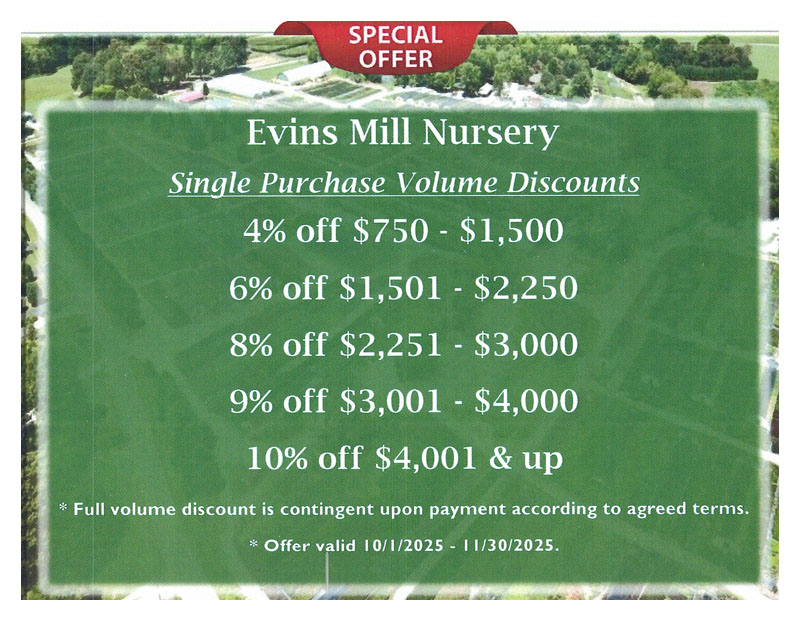 Evins Mill Nursery is located in DeKalb County, Smithville, Tennessee near beautiful Center Hill Lake and close to Warren County, McMinnville, TN. This section of Middle Tennessee is known as the "Nursery Capital" of the world. All plants sold by Evins Mill Nursery have been inspected by the Tennessee Department of Agriculture and are certified to be disease and insect free. At Evins Mill Nursery customer service is extremely important to us and we strive to provide our customers with quality plants at the best price.