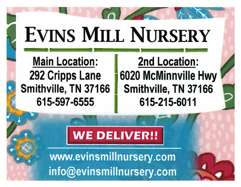 Evins Mill Nursery is located in DeKalb County, Smithville, Tennessee near beautiful Center Hill Lake and close to Warren County, McMinnville, TN. This section of Middle Tennessee is known as the "Nursery Capital" of the world. All plants sold by Evins Mill Nursery have been inspected by the Tennessee Department of Agriculture and are certified to be disease and insect free. At Evins Mill Nursery customer service is extremely important to us and we strive to provide our customers with quality plants at the best price.