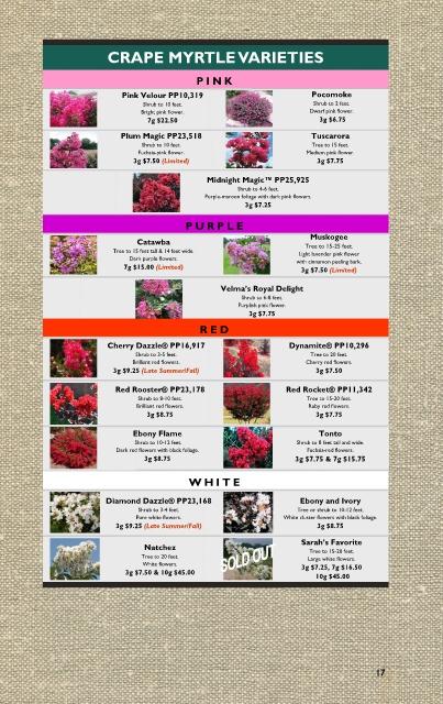CRAPE MYRTLE PINK Pink Velour PP10,319 Shrub to 10 feet. Bright pink flower. 7g $22.50 Plum Magic PP23,518 Shrub to 10 feet. Fuchsia-pink flower. 3g $7.50 (Limited) PURP Catawba Tree to 15 feet tall & 14 feet wide. Dark purple flowers. 7g $15.00 (Limited) RED Cherry Dazzle® PP16,917 Shrub to 3-5 feet. Brilliant red flowers. 3g $9.25 (Late Summer/Fall) Red Rooster® PP23,178 Shrub to 8-10 feet. Brilliant red flowe