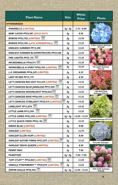 HYDRANGEA ANNABELLE (LIMITED) BOBO® PP22,782 (LIMITED) ENDLESS SUMMER PP15,298 FIRE LIGHT® PP25,135 INCREDIBALL® PP20,571 LADY IN RED PP15,175 LIMELIGHT PP12,874 LITTLE LAMB PP15,395 NIKKO BLUE (LIMITED) OAKLEAF (LIMITED) PENNY MAC PHANTOM ZINFIN DOLL® PP26,956