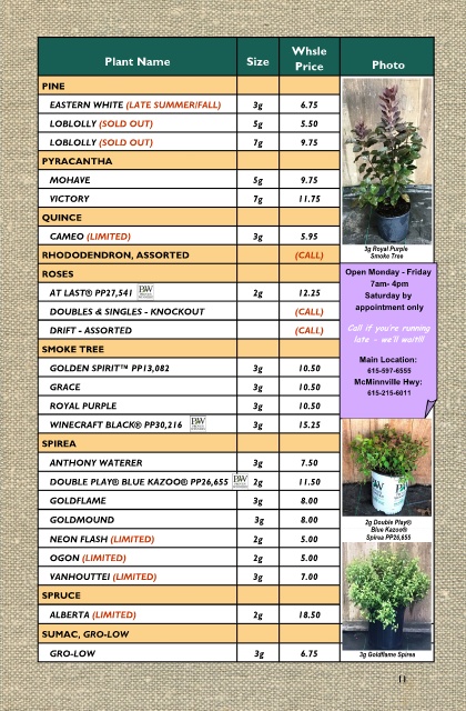 Photo Tree Open Monday - Friday 7am- 4pm Saturday by appointment only Call if you’re running late - we’ll wait!!! Main Location: 615-597-6555 McMinnville Hwy: 615-215-6011 2g Double Play® Blue Kazoo® Spirea PP26,655 3g Goldflame Spirea 11 11