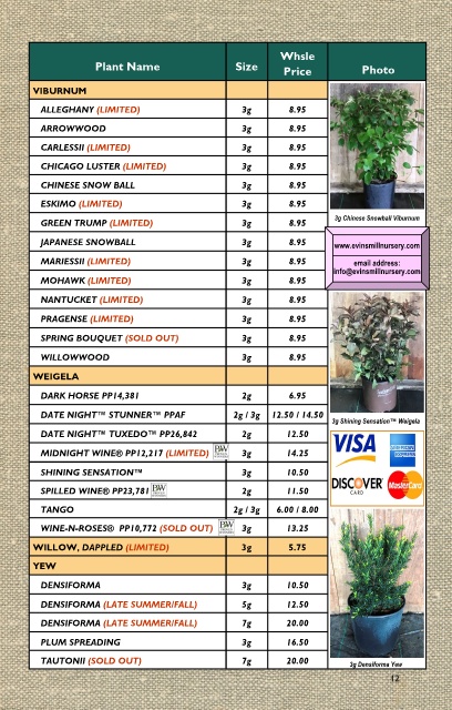VIBURNUM ALLEGHANY (LIMITED) ARROWWOOD CARLESSII (LIMITED) CHINESE SNOW BALL ESKIMO (LIMITED) GREEN TRUMP (LIMITED) JAPANESE SNOWBALL MARIESSII (LIMITED) MOHAWK (LIMITED) NANTUCKET (LIMITED) PRAGENSE (LIMITED) WILLOWWOOD WEIGELA DARK HORSE PP14,381 SHINING SENSATION™ SPILLED WINE® PP23,781 TANGO YEW DENSIFORMA PLUM SPREADING TAUTONII (SOLD OUT)