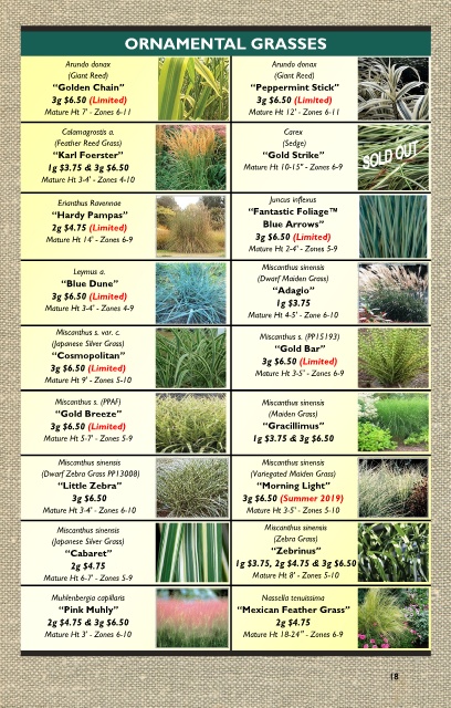 Arundo donax (Giant Reed) “Peppermint Stick” 3g $6.50 (Limited) Mature Ht 12' - Zones 6-11 Carex (Sedge) “Gold Strike” Mature Ht 10-15" - Zones 6-9 Juncus inflexus “Fantastic Foliage™ Blue Arrows” 3g $6.50 (Limited) Mature Ht 2-4' - Zones 5-9 Miscanthus sinensis (Dwarf Maiden Grass) “Adagio” 1g $3.75 Mature Ht 4-5' - Zone 6-10 Miscanthus s. (PP15193) “Gold Bar” 3g $6.50 (Limited) Mature Ht 3-5' - Zones 6-9 Miscant