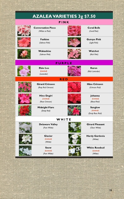 AZALEA Conversation Piece (White to Pink) Fashion (Salmon Pink) Wakaebisu (Salmon Pink) Elsie Lee (Limited) (Lavender) Girard Crimson (Rosy Red Crimson) Hino Degiri (Limited) (Rose Crimson) Midnight Flare (Deep Red) Delaware Valley (Pure White) Glacier (Limited) (White) Snow (Limited) (Pure White)