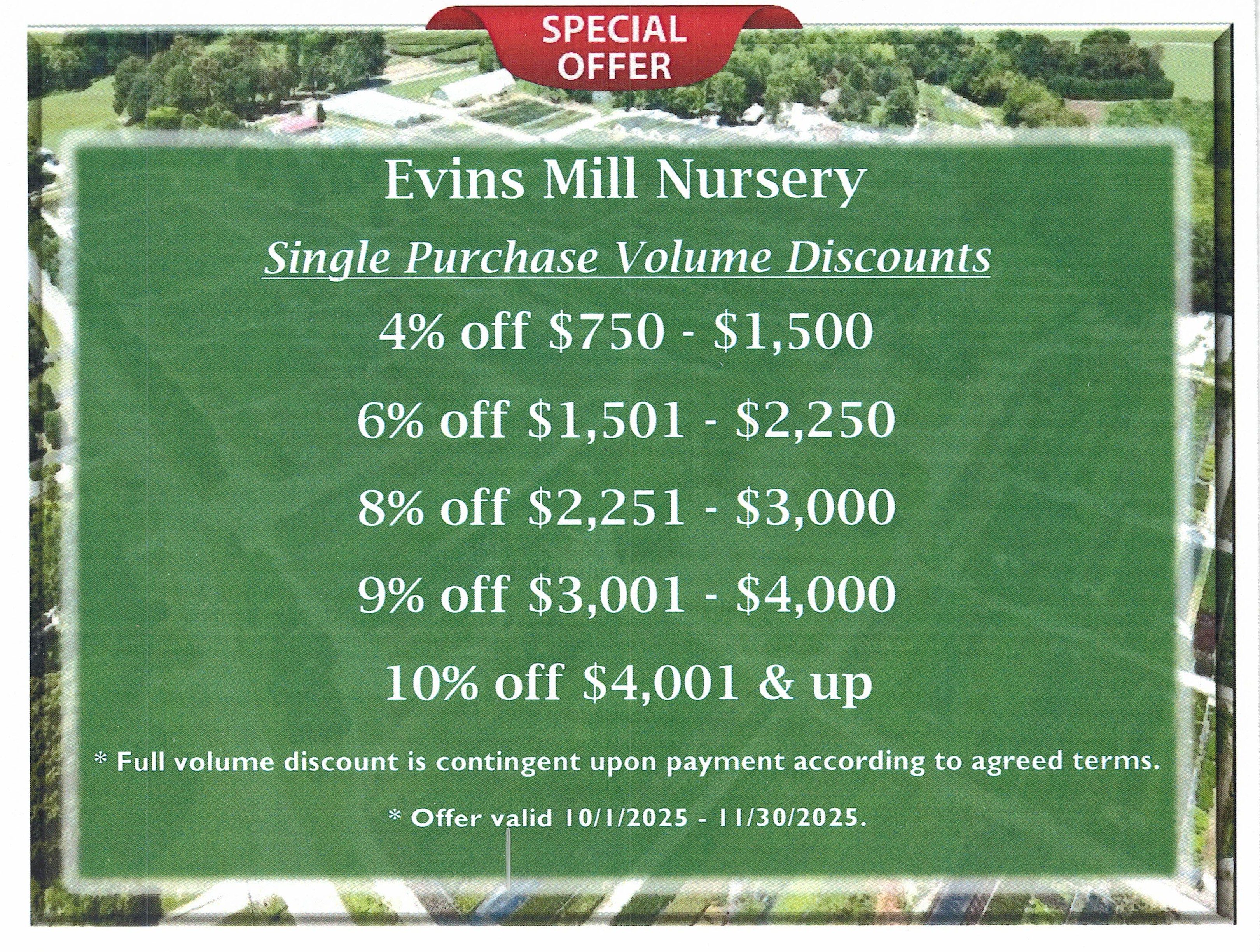 Evins Mill Nursery is located in DeKalb County, Smithville, Tennessee near beautiful Center Hill Lake and close to Warren County, McMinnville, TN. This section of Middle Tennessee is known as the "Nursery Capital" of the world. All plants sold by Evins Mill Nursery have been inspected by the Tennessee Department of Agriculture and are certified to be disease and insect free. At Evins Mill Nursery customer service is extremely important to us and we strive to provide our customers with quality plants at the best price.